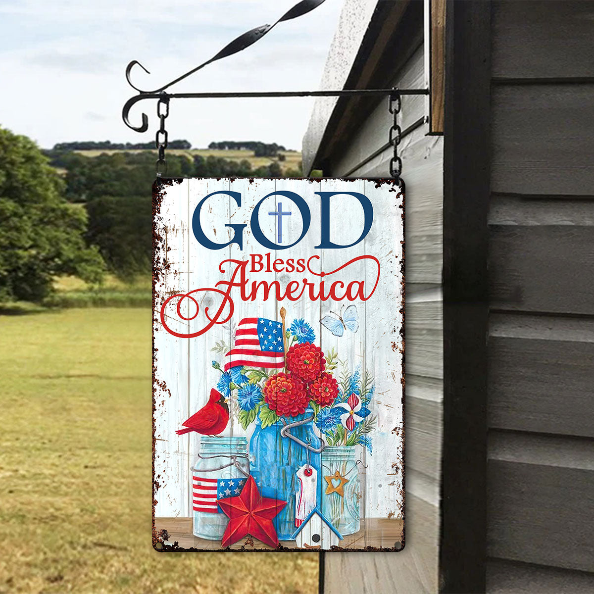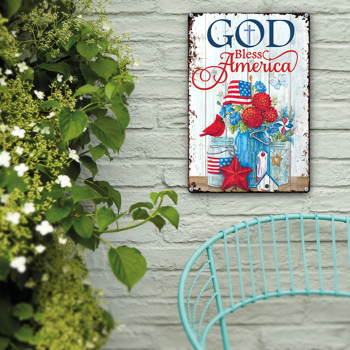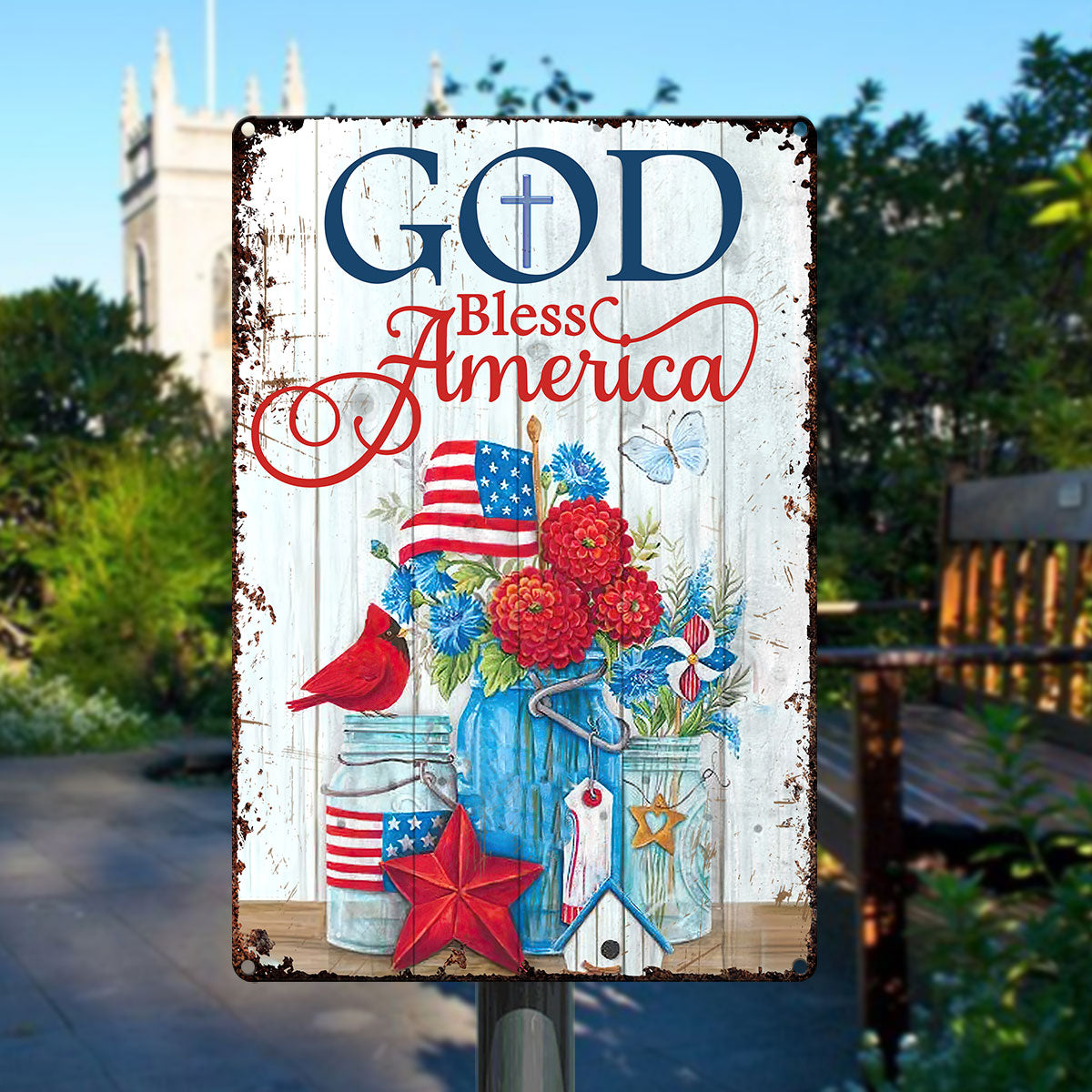 UX Jesus Lovely Metal Sign Flower Cardinal God Bless America NUM472